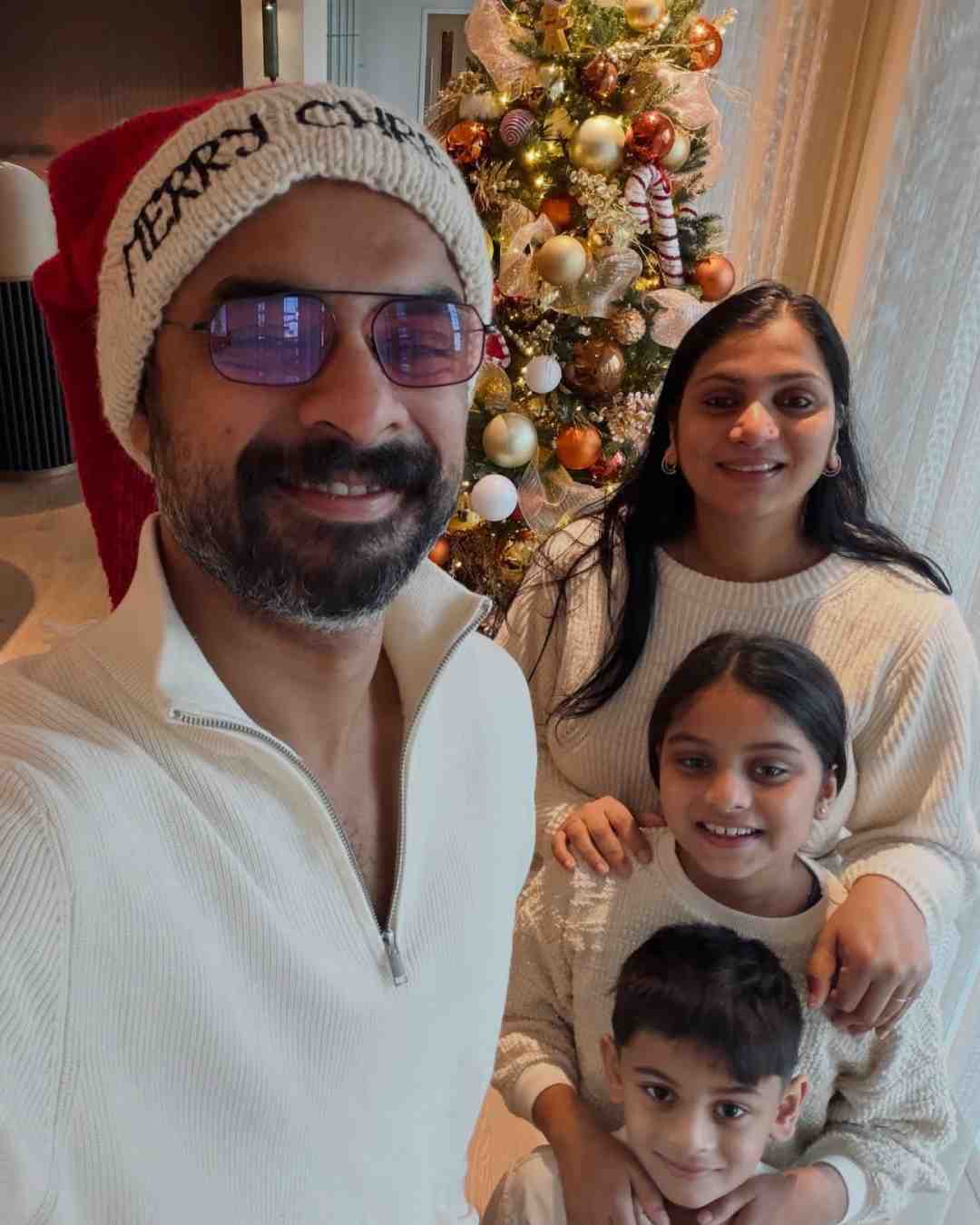 Actor Tovino Thomas clicked a selfie with his family. The actor charmed up in a crisp white shirt and Santa cap.