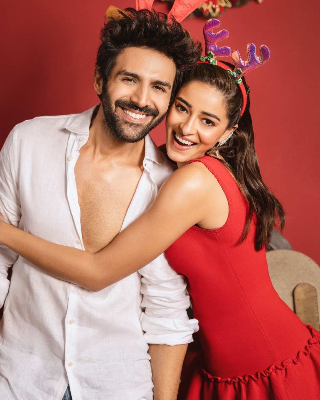 As part of the promotion for their new film Tu Meri Mein Tera Mein Tera Tu Meri, actor Kartik Aaryan and Ananya Panday shared a hug for a photo. Kartik sported a crisp white shirt, while Ananya looked adorable in a red dress and a deer‑horn headband.