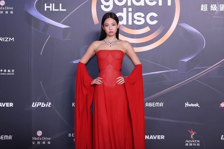 Blackpink member Jennie looked elegant in a strapless, form-fitting red dress that extends into a long, flowing train. The dress included dramatic, detached long sleeves that draped elegantly. The 29-year-old singer performed as a solo artist at this ceremony for the first time. She also won an award for her song Like Jennie.