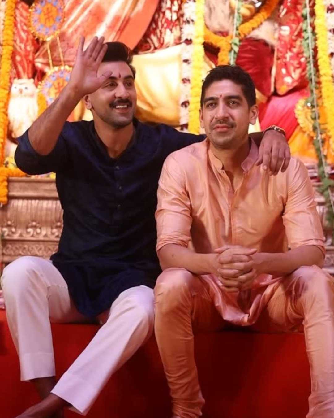 Bollywood star Ranbir Kapoor embraced the festive spirit as he paid a visit to the north Bombay Durga Puja pandal. Dressed in a blue ethnic kurta, he was seen posing with filmmaker Ayan Mukerji, one of the key organisers of the puja.