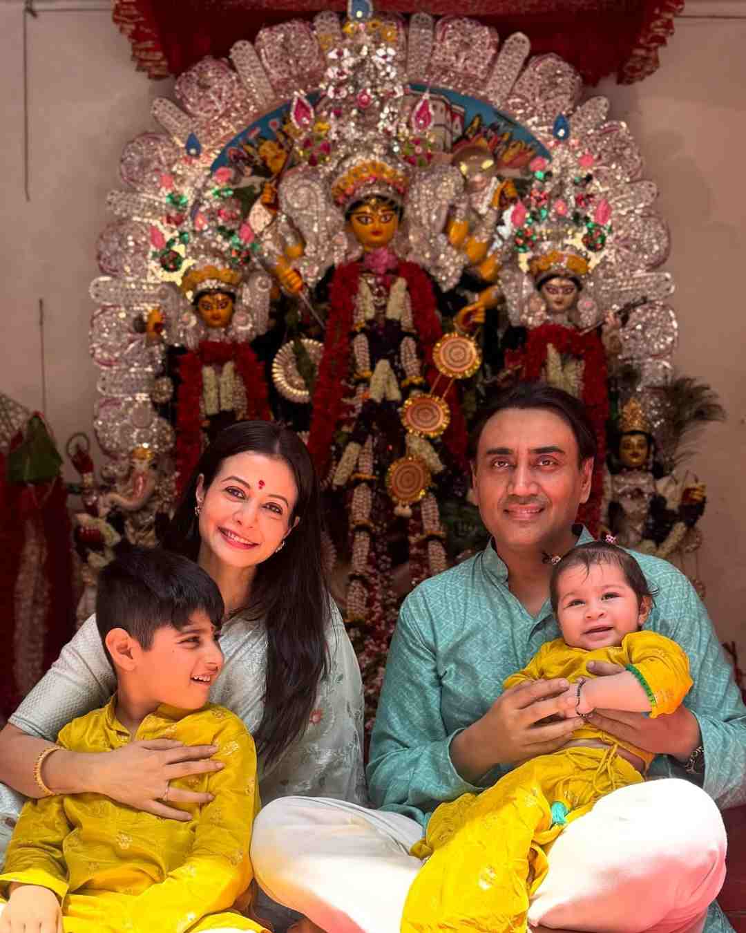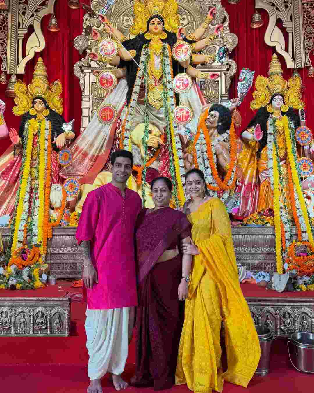 Actress Sumona Chakravarti celebrated Maha Saptami with her family at North Bombay Durga Puja. She looked elegant in a yellow jamdani sari as she posed inside a pandal.