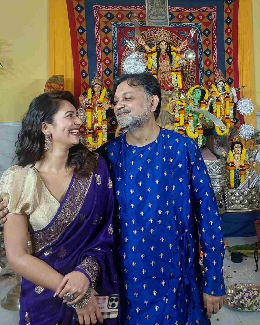 Tollywood star Koel Mullick exuded grace in an ivory sari as she marked Durga Puja celebrations on Monday, accompanied by her husband, producer Nispal Singh, at her Bhowanipur residence.