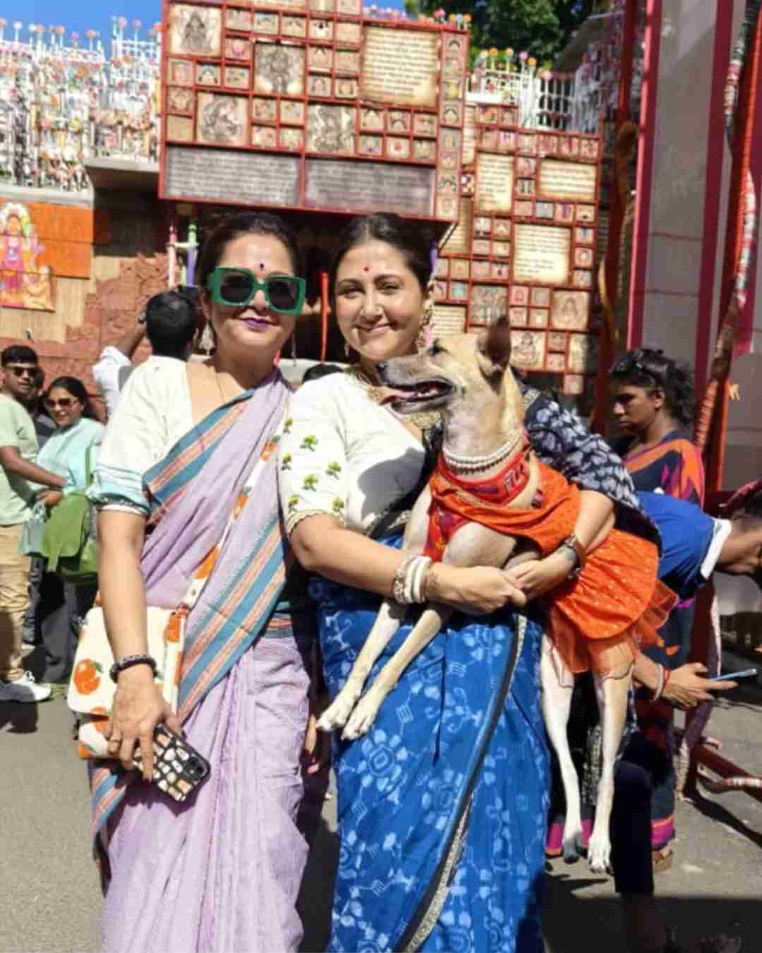 Actress Swastika Mukherjee opted for a graceful look in a blue printed cotton sari as she stepped out for a pandal visit, accompanied by her beloved fur baby.
