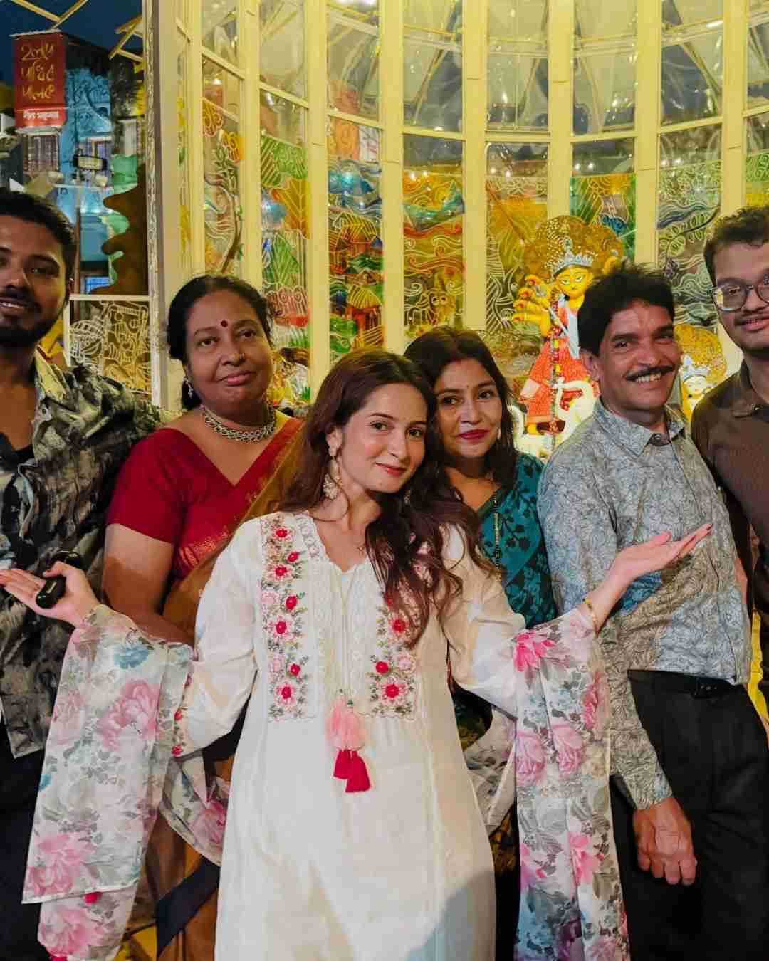 Television actress Shreema Bhattacherjee spent a pleasant Saptami evening with her family. The actress looked stunning in a simple yet elegant white salwar suit adorned with floral embroidery.