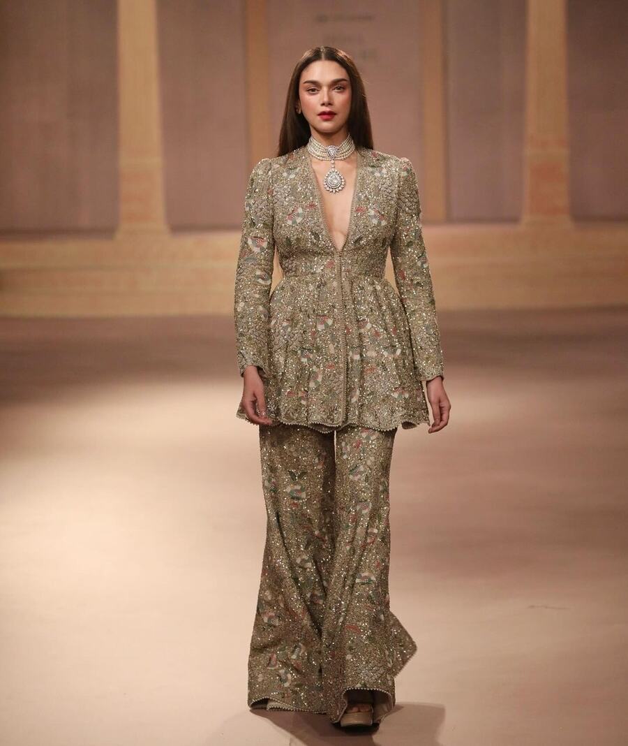 Sonakshi’s Heeramandi co-star Aditi Rao Hydari stunned as a showstopper in a sequined Jayanti Reddy sharara suit. The fit-and-flare tunic featured a plunging neckline. Sleek hair, a layered choker and vibrant red lips enhanced the visual appeal of Aditi’s ensemble.