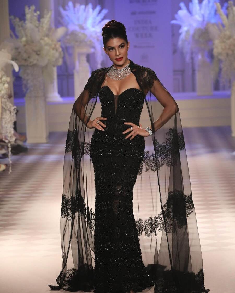 Jacqueliene Fernandez turned showstopper for couturier Isha Jajodia. The 31-year-old actress looked ethereal in a black column gown. A tulle veil pinned to the shoulders and a statement diamond neckpiece added a touch of drama to Jacqueliene’s outfit.
