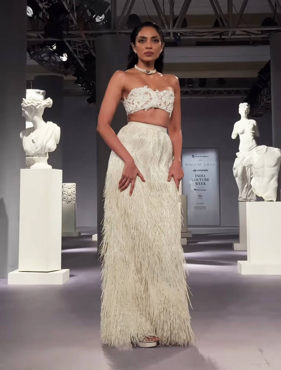 Monkey Man actress Sobhita Dhulipala strutted down the runway in a strapless lacy white blouse paired with a matching fringed skirt by Rimzim Dadu. Nude makeup and silver wedges rounded off Sobhita’s look.