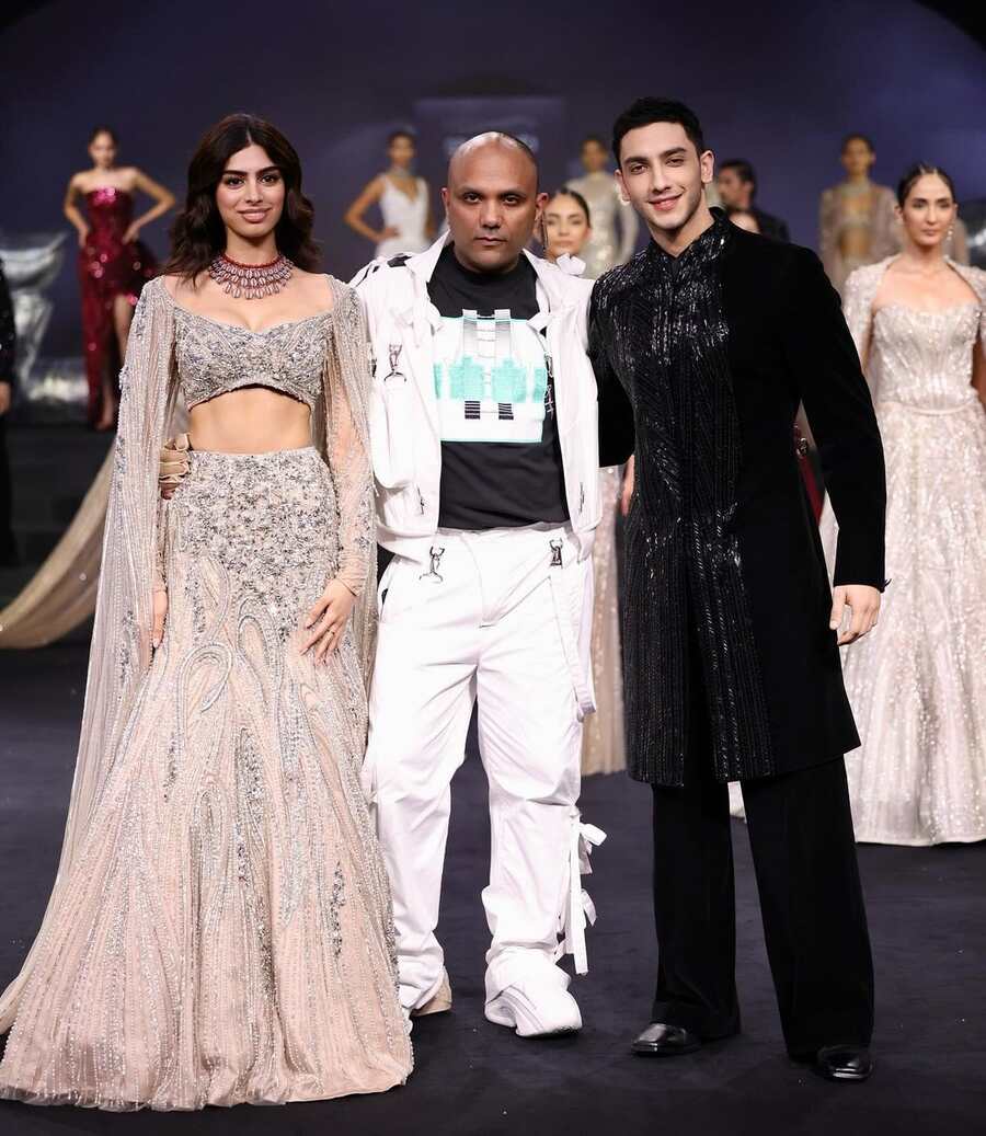 The Archies stars Khushi Kapoor and Vedang Raina turned showstoppers for designer Gaurav Gupta. The event marked Khushi’s runway debut. The 23-year-old actress dazzled in a silver lehenga, featuring an off-shoulder blouse and a matching embellished skirt. Khushi pinned the dupatta to her shoulders and opted for heavy jewellery to complete her look. Vedang, on the other hand, looked dapper in a shimmery black bandhgala.