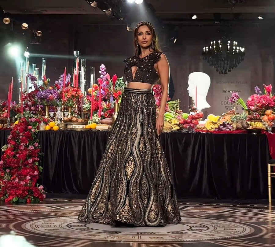 Malaika Arora walked the ramp as a showstopper for couturier Siddartha Tytler. The 50-year-old actress-model rocked a blue-and-golden sequined lehenga. Stone-studded danglers and a matching hair accessory accentuated Malaika’s outfit.