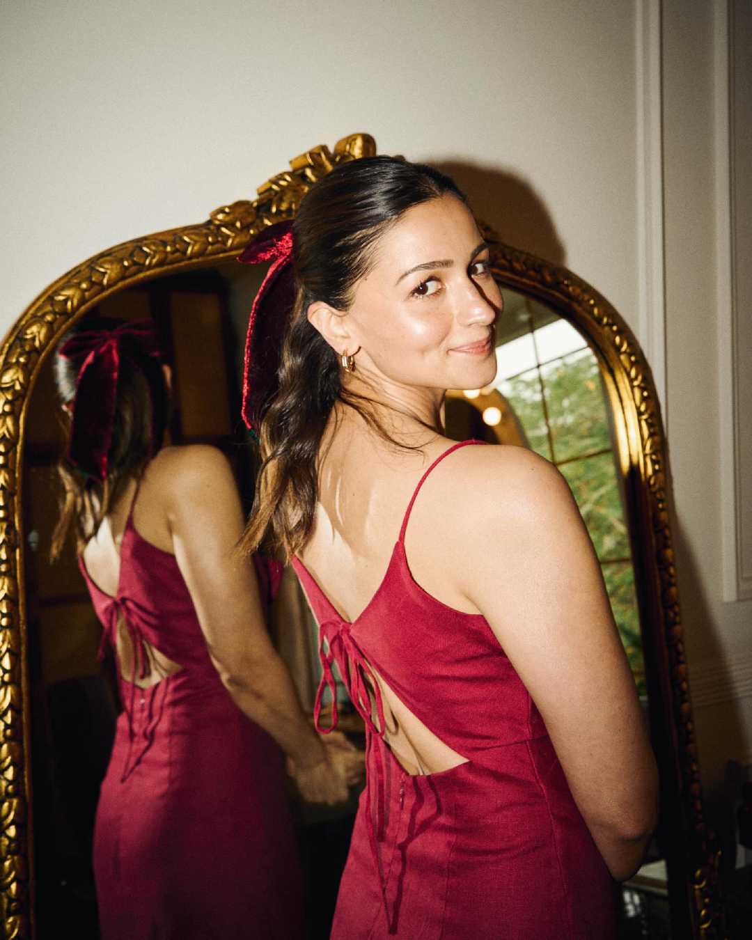 A red strappy dress with a back-slit and a matching bow tied to her hair made for Alia’s second look of the evening. Pink nails, a silver studded finger ring and glittery eye shadow added a Christmassy touch to her ensemble.
