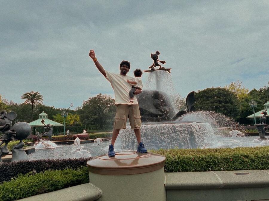 Vignesh struck a pose in front of a fountain featuring Mickey Mouse with one of his kids.