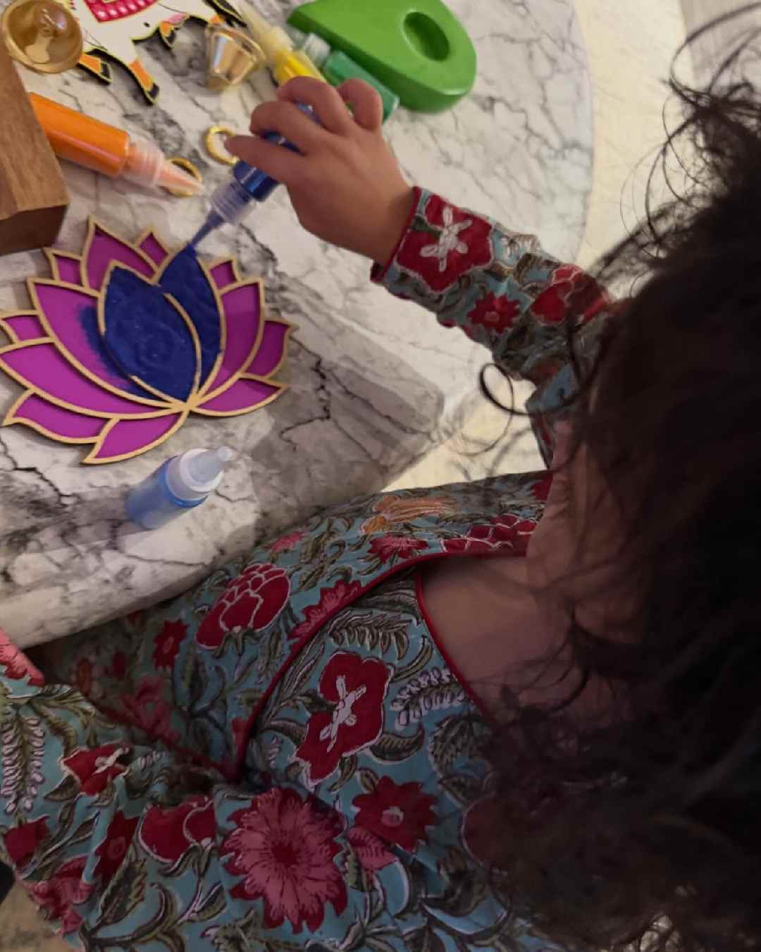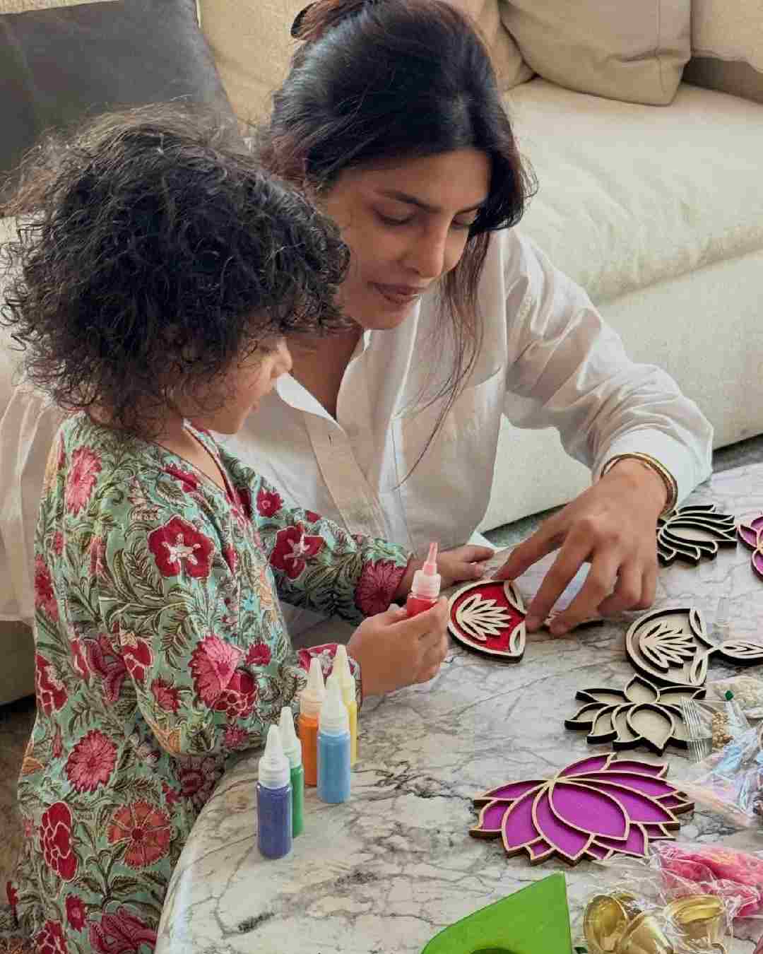 Actress Priyanka Chopra celebrated Diwali with her husband Nick Jonas, daughter Malti Marie Chopra Jonas and mother Dr. Madhu Chopra in New York, show pictures posted by her on Wednesday. From Malti making rangolis to Priyanka offering prayers with Nick and their daughter, here’s a look at some moments from the family’s celebration.