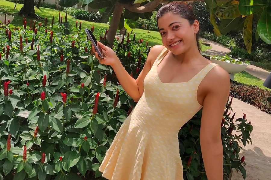 Rashmika, who last starred in the Telugu romantic drama The Girlfriend, smiled for a picture in a garden.