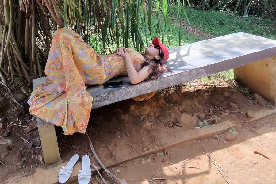 In one of the photos, Rashmika is seen relaxing on a bench in a yellow maxi dress.