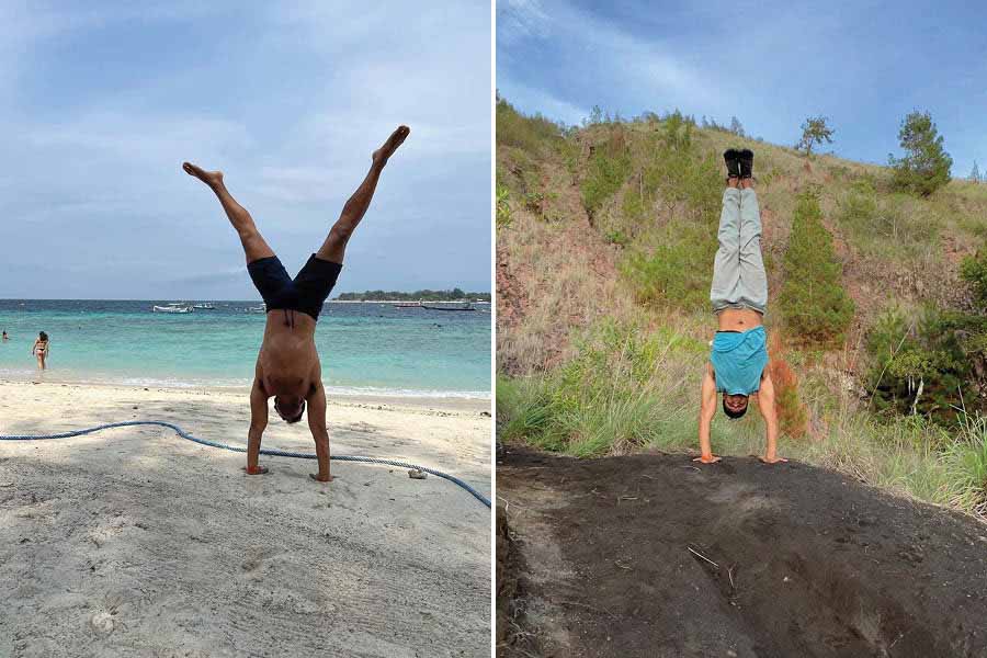 Nupur nails the handstand pose, whether it’s on the beach or on a hilltop.