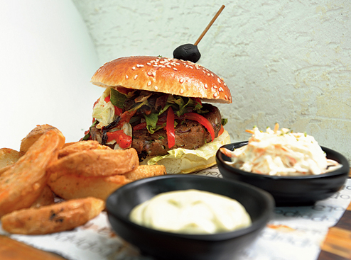 A regular shami kebab is the patty for the Lamb Shami Kebab Burger, which is served up with wedges, mint mayo and coleslaw.