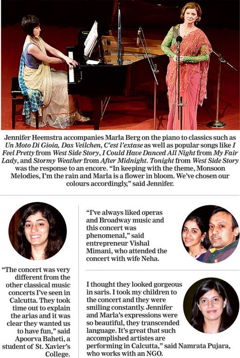 Pianist Jennifer and opera singer Marla from Cleveland performed classical pieces as well as songs from popular Broadway musicals. This is the last of the six concerts of the Kolkata Classics concert series, all partnered with The Telegraph that Marla has participated in. She has also performed for students of the Birla schools, and NGOs.