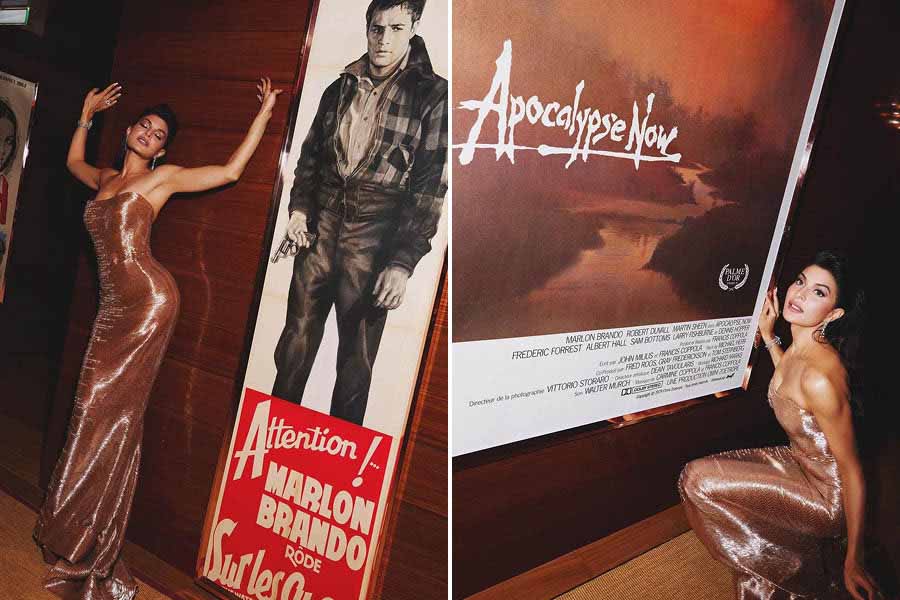 The actress posed with posters of Elia Kazan’s 1954 crime drama On the Waterfront and Francis Ford Coppola’s 1979 epic war film Apocalypse Now at the 77th edition of the film festival in France.