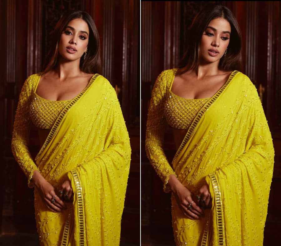Janhvi Kapoor looked stunning in a yellow embellished sari adorned with tassels. She paired it with an embroidered full-sleeved blouse that featured a square neckline. The actress wore her hair down and chose minimal accessories and dewy makeup to complete her look.