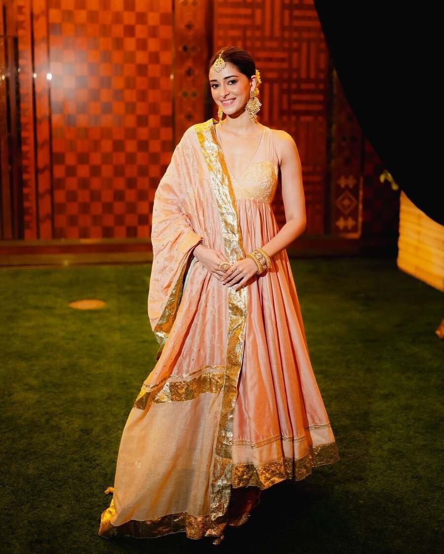 Ananya Panday wore a peach anarkali suit with golden borders. She accessorised her ensemble with a stone-studded maang tikka, layered danglers and golden bangles. A sleek bun adorned with a gajra completed Ananya’s look for the event.