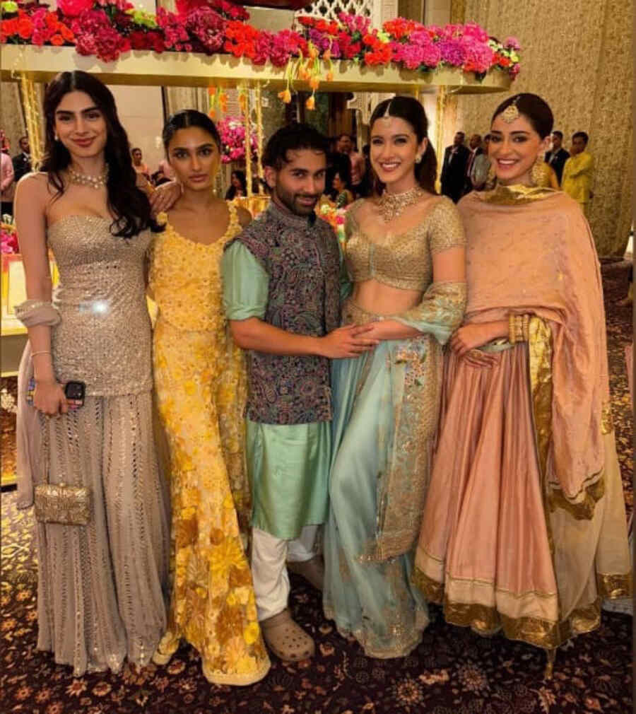 While Khushi Kapoor twirled in a strapless sharara suit, Shanaya Kapoor stunned in a blue and golden lehenga. Orry donned a turquoise kurta paired with a monochrome waistcoat and beige Crocs.