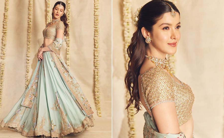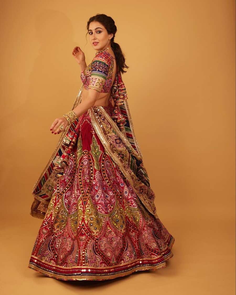 Sara Ali Khan rocked a Tanya Ghavri-designed lehenga choli. The hand-embroidered ensemble included a tie-black blouse adorned with handmade latkans. Kohl-rimmed eyes, bangles, darkened eyebrows and a bindi perfectly balanced Sara’s look.