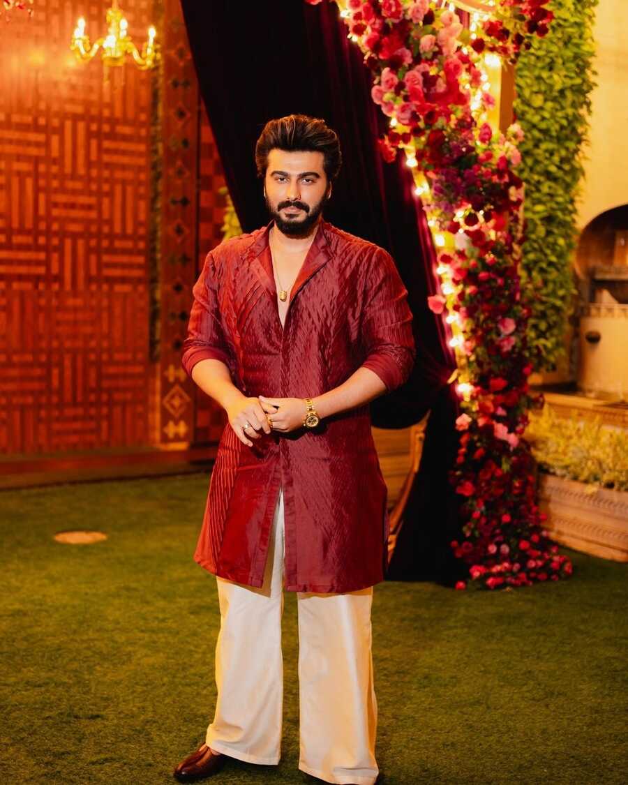 Arjun Kapoor, who is set to play the role of an antagonist in Rohit Shetty’s upcoming cop drama Singham Again, looked dapper in a maroon kurta, white trousers and leather moccasins.