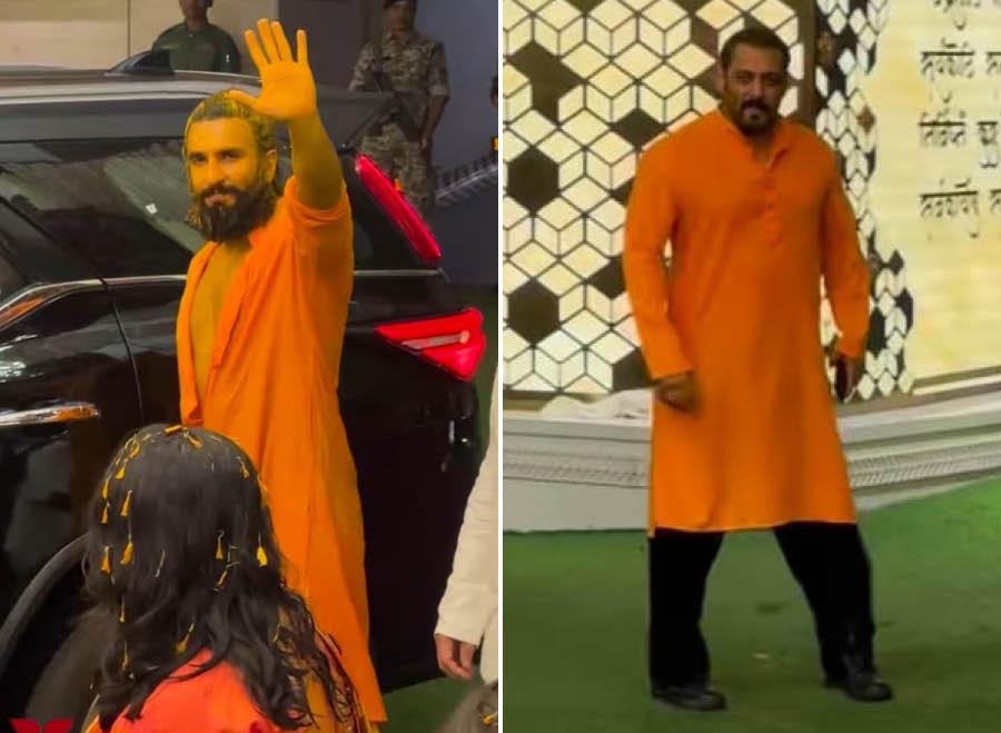 Arjun’s Singham Again co-star Ranveer Singh grabbed eyeballs in an orange kurta. Salman Khan was also spotted in a saffron kurta paired with black trousers.