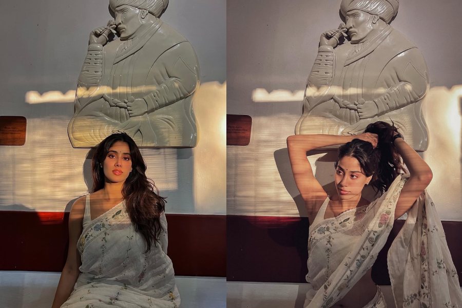 Janhvi looked ethereal as she posed for sun-kissed pictures in a white floral print sari. In the photo, the actress effortlessly embraced a fresh, no-makeup look.
