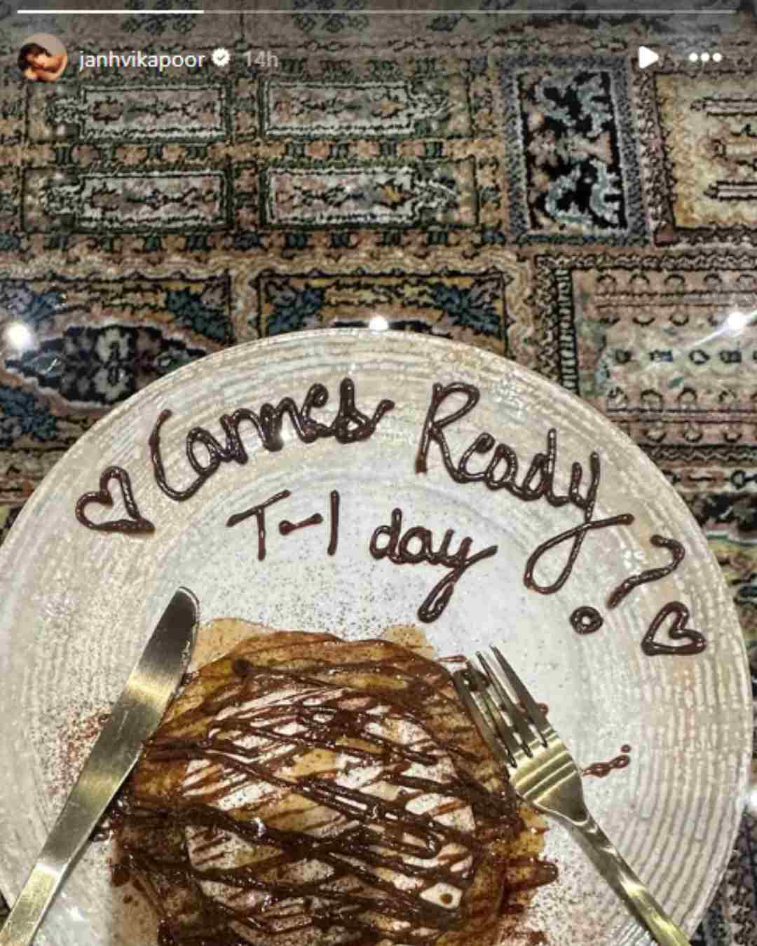 Ahead of her Cannes red carpet debut and world premiere of Neeraj Ghaywan’s Homebound, Janhvi Kapoor pampered herself with a dessert treat. The 29-year-old actress posted a picture on Instagram story that features a plate of pancakes adorned with the message, “Cannes Ready? T-1 day” using chocolate sauce.