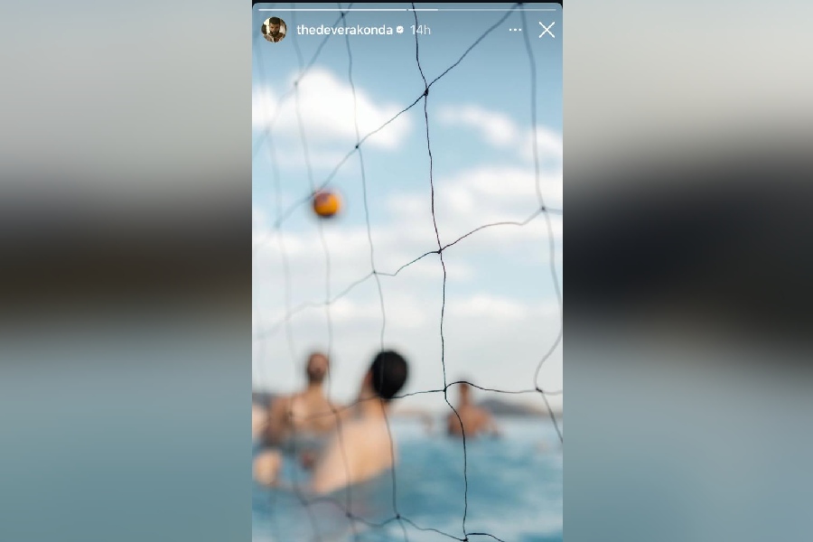 A photo shared by Vijay, framed through a volleyball net, shows players silhouetted in the water with a ball suspended mid-air, hinting at a game in progress.