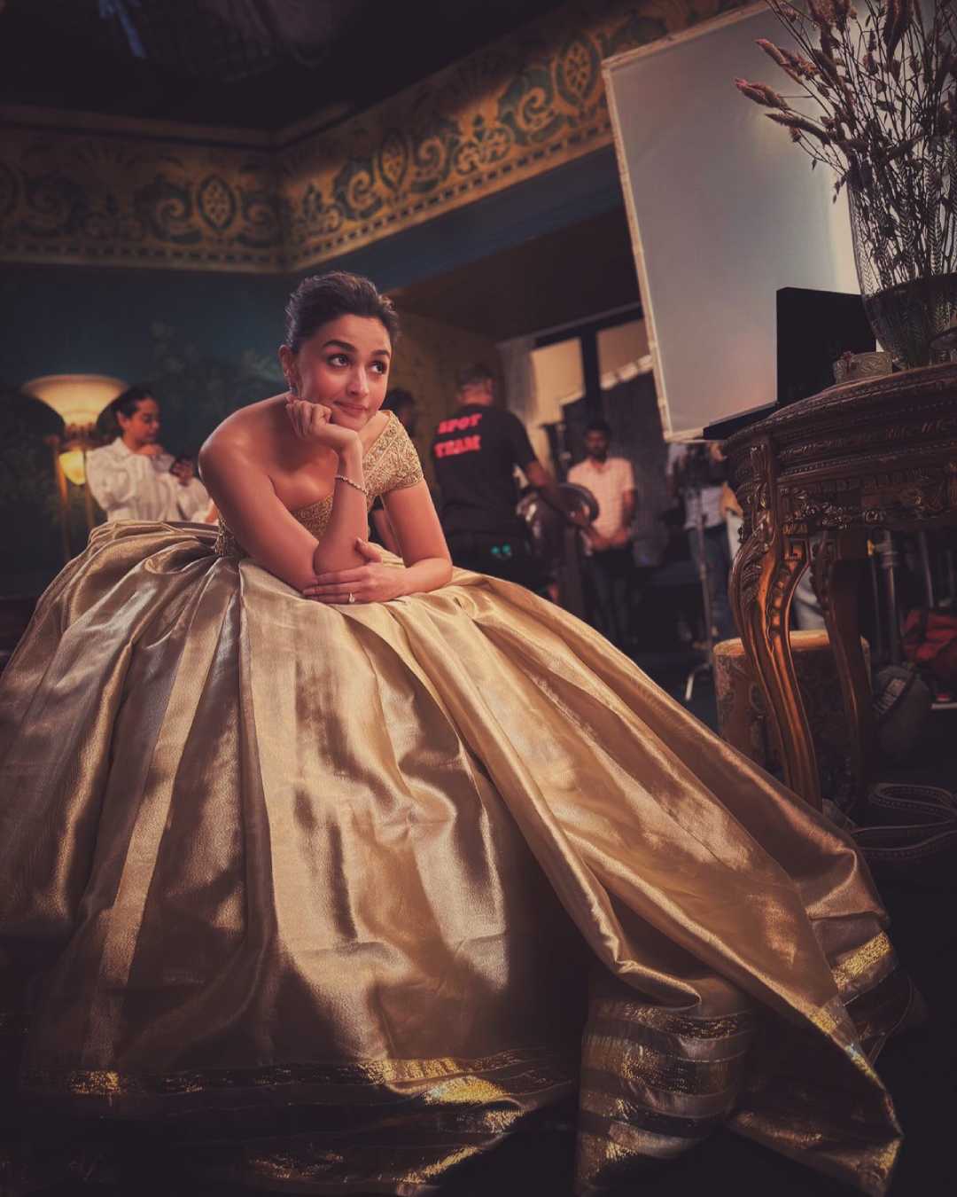 The Gangubai actress appeared lost in her thoughts in a glamorous golden off-shoulder gown with golden borders. She captioned her post, “bits of here and there.”