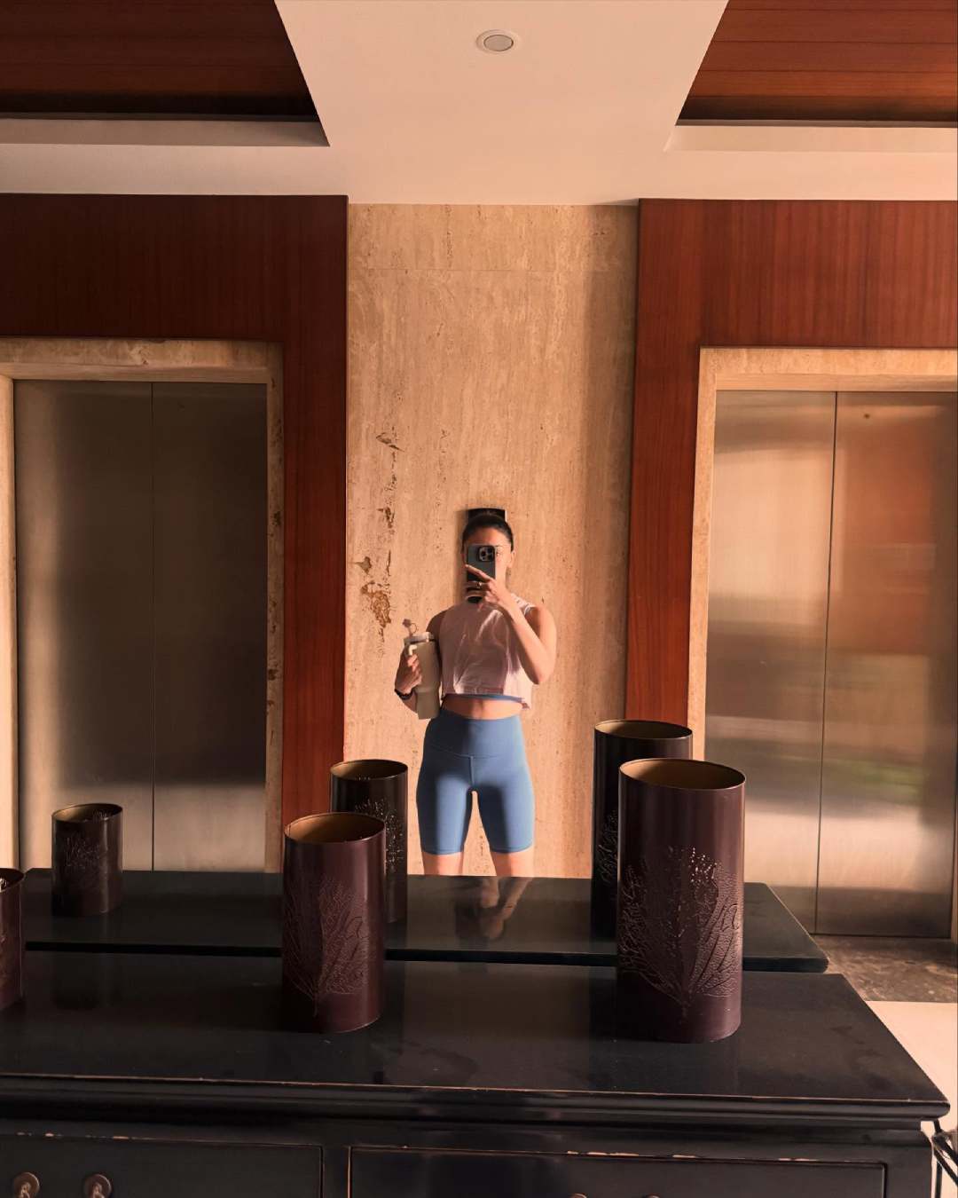 Alia snapped a stylish mirror selfie after her gym session. She sported a chic off-white crop top paired with blue shorts.