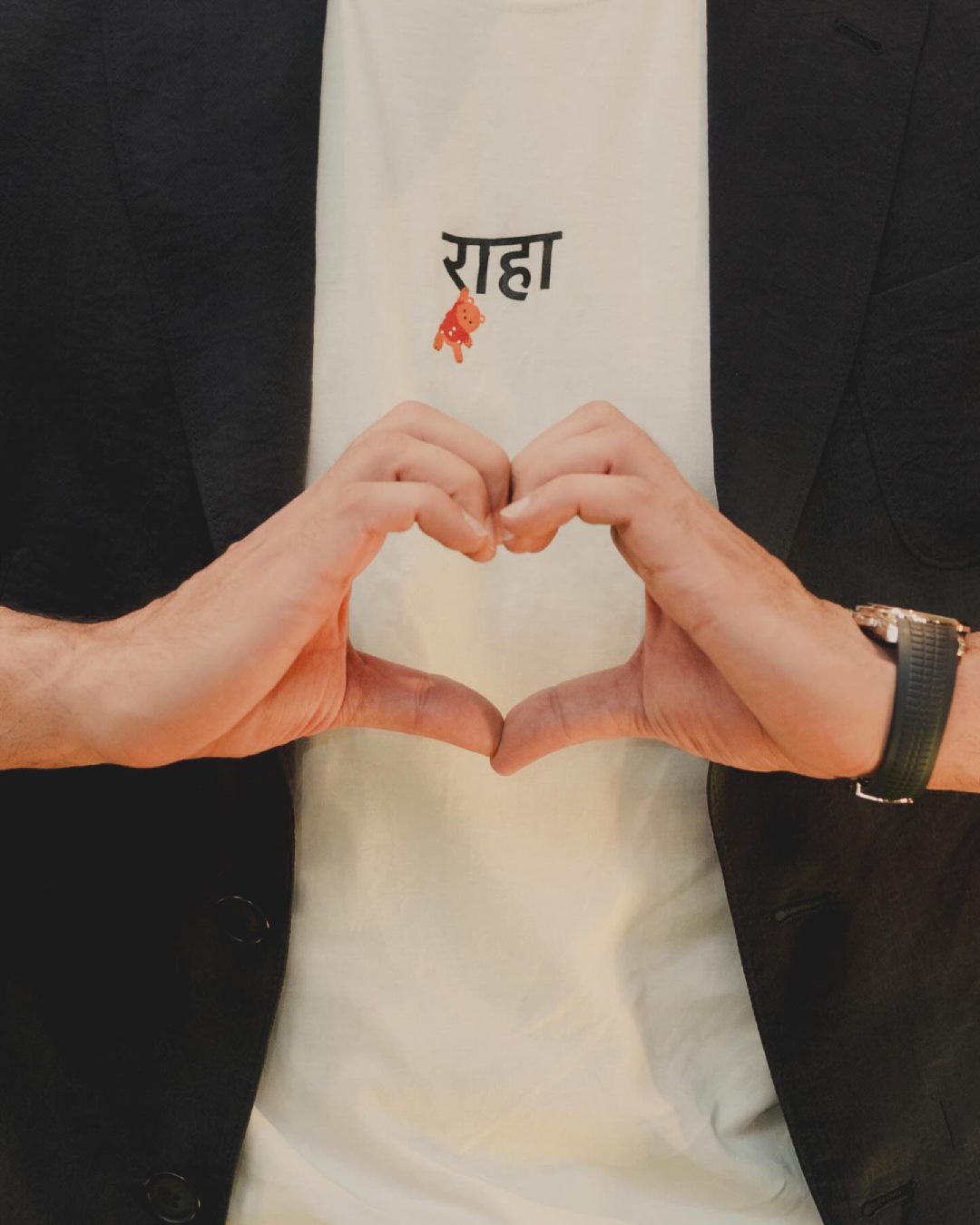 The Jigra actress shared a snap of a person, presumably Ranbir Kapoor, wearing a white T-shirt with the word ‘Raha’ written in Hindi on it. The person in the photo sports a black suit jacket and makes a heart sign with his hands.