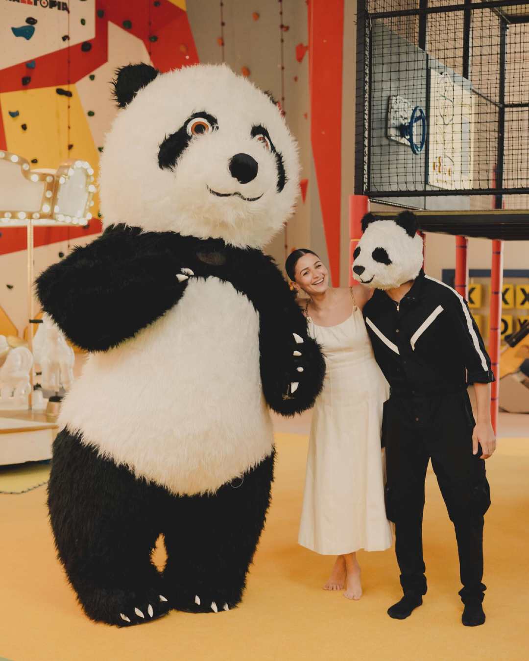 The actress beamed with joy as she posed with two adorable panda costume characters, radiating simplicity and elegance in her stunning white maxi dress.