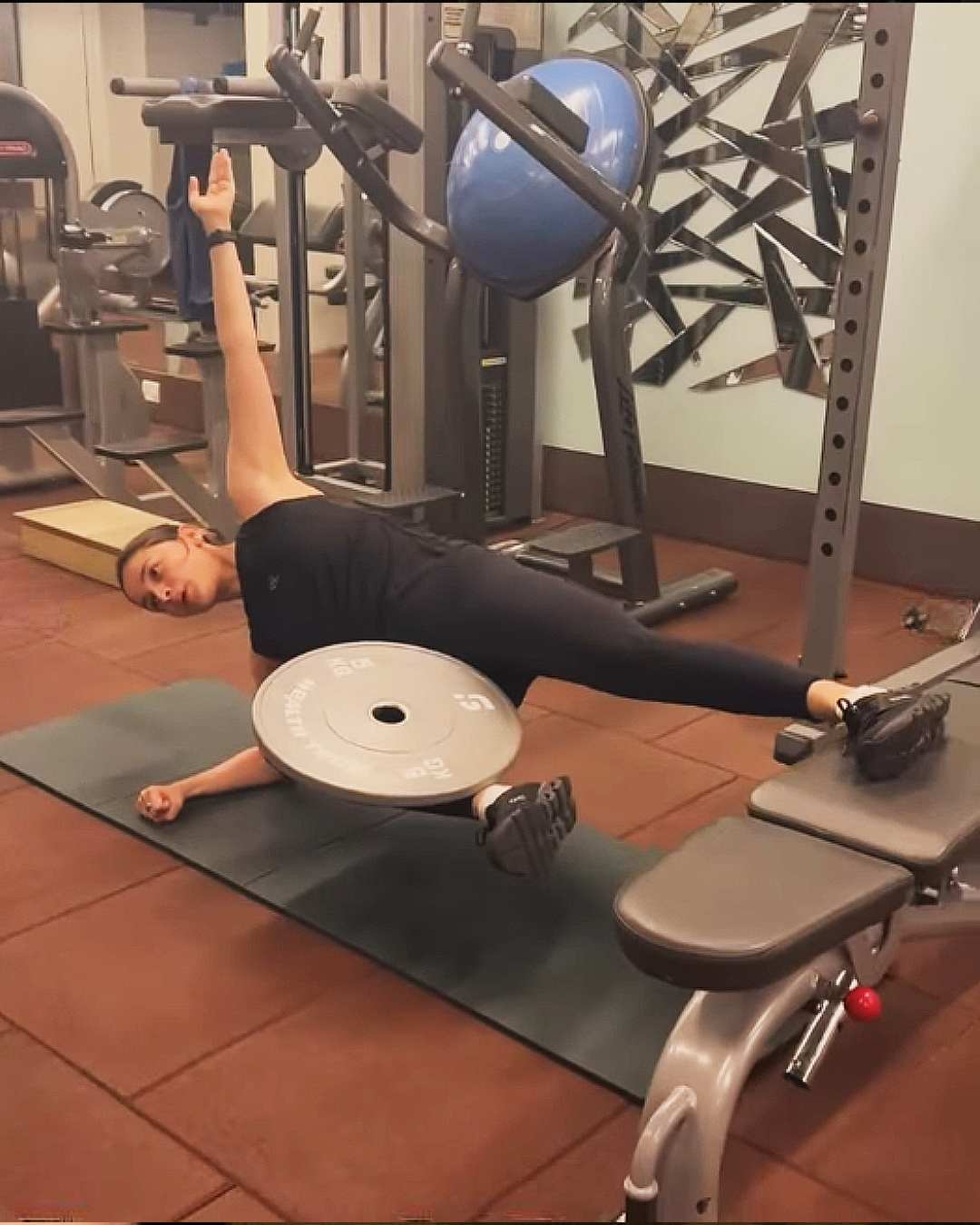 The actress nailed a challenging side plank pose, balancing on one hand, at the gym.