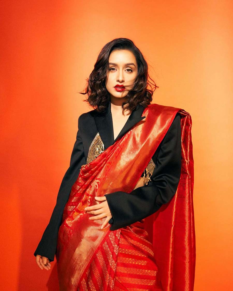 Shraddha Kapoor donned an orange-red sari paired with a black blazer-like blouse to grace the occasion.