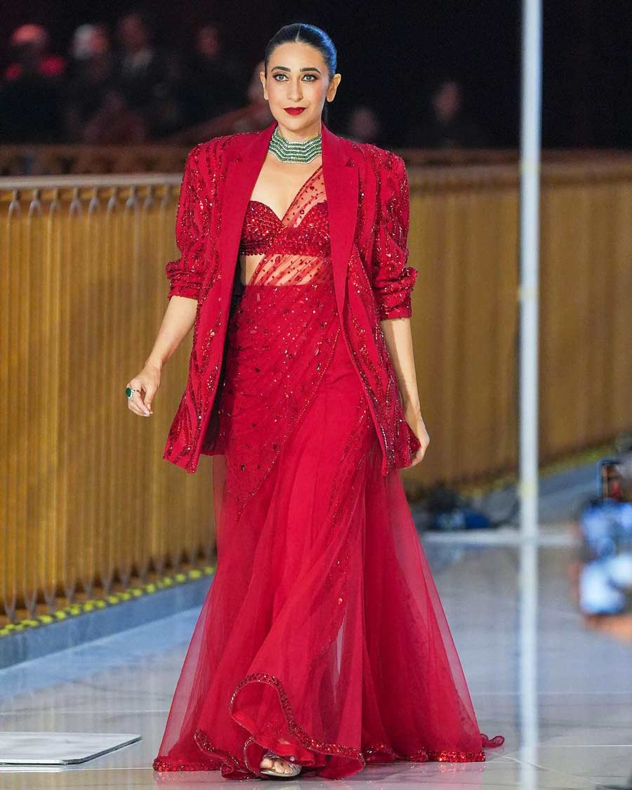 Karisma Kapoor dazzled in a Manish Malhotra cherry-red suit sari.