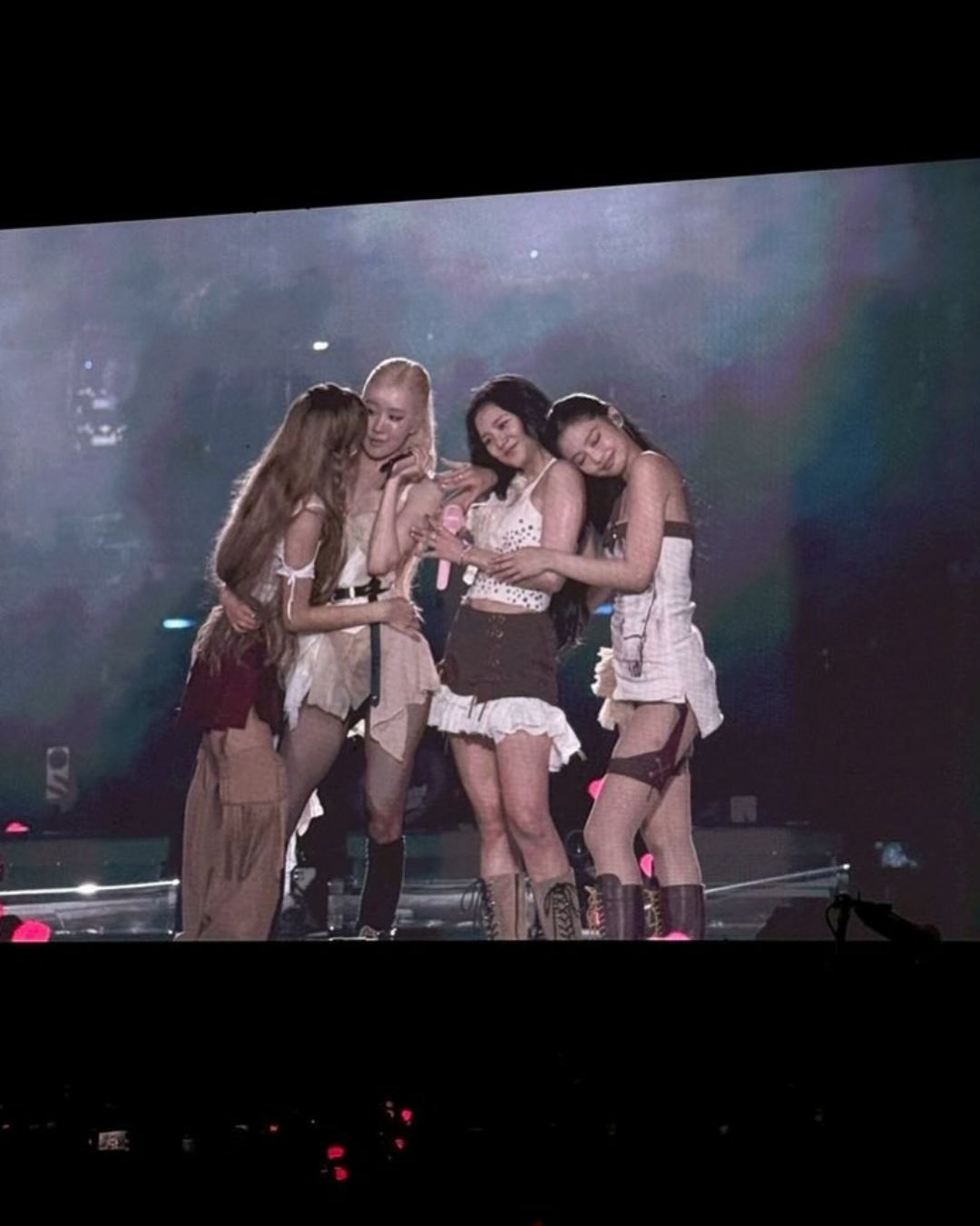 Blackpink members shared an embrace during their performance. The band kicked off their reunion concert on July 5 at Goyang Stadium.