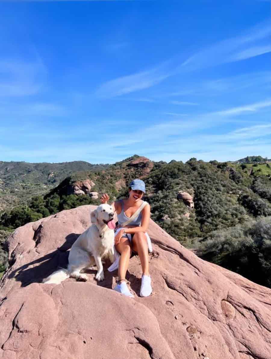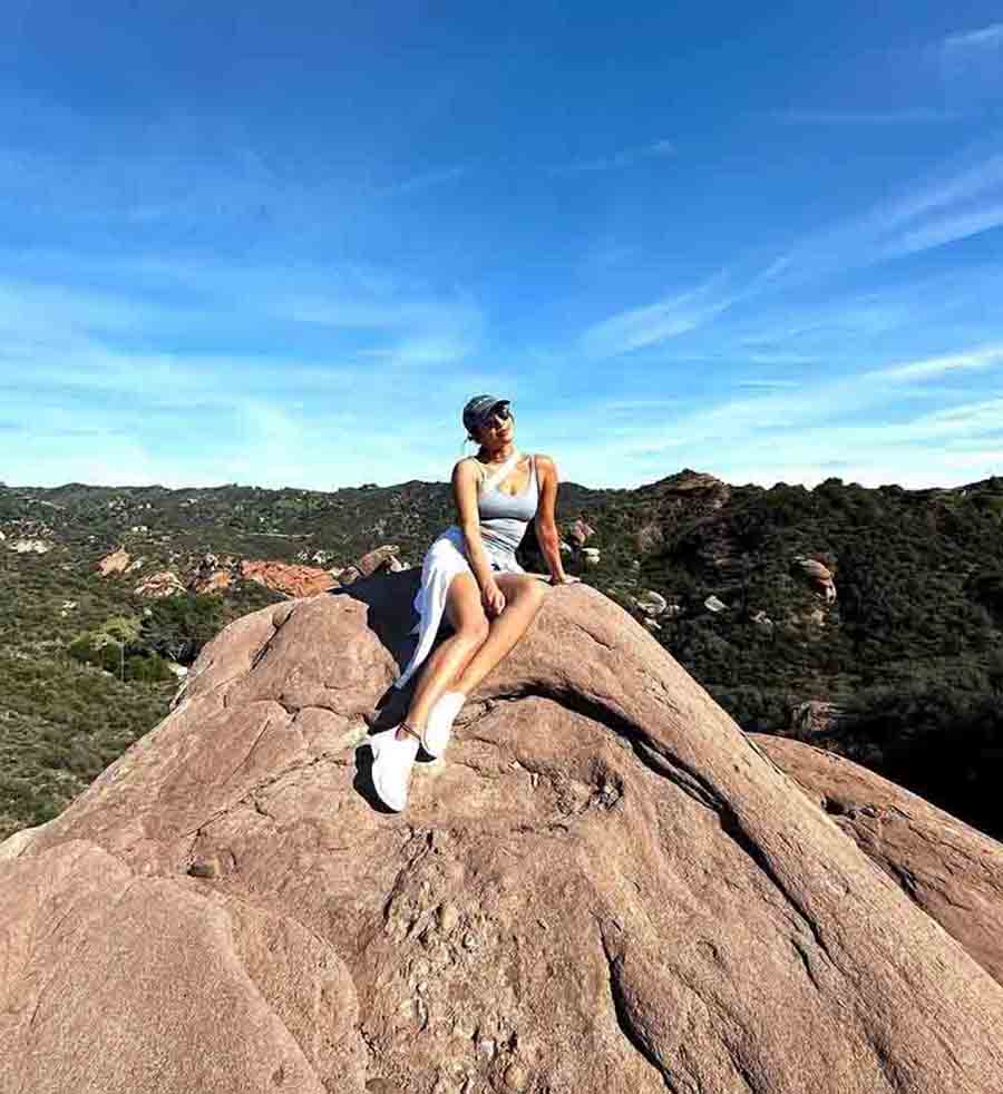 Priyanka Chopra enjoyed an afternoon stroll at Topanga Canyon in California and posed for the lens atop a hill against a picturesque backdrop. She sported a sky blue co-ord set paired with blue cap, black sunglasses and white sneakers.