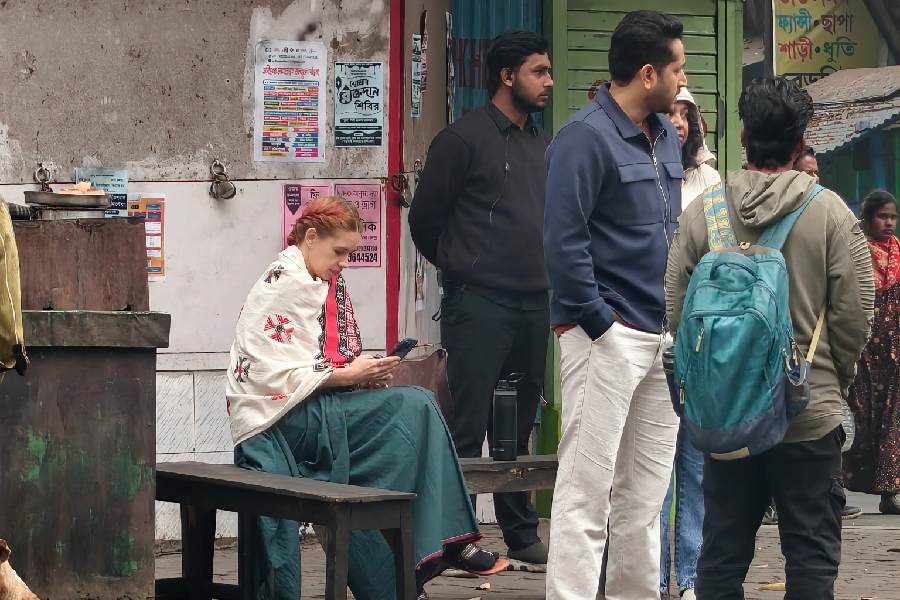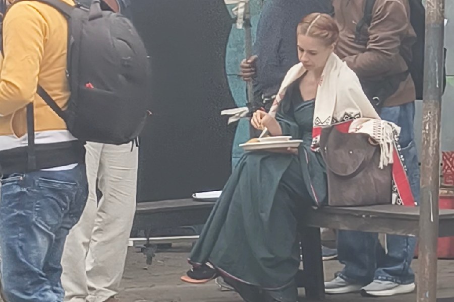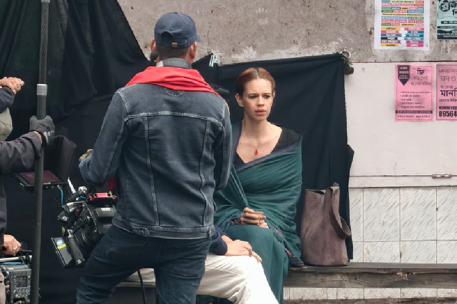 Sporting a green sari a white shawl, Kalki sat on a wooden bench at College Street, quietly scrolling through her phone between takes.