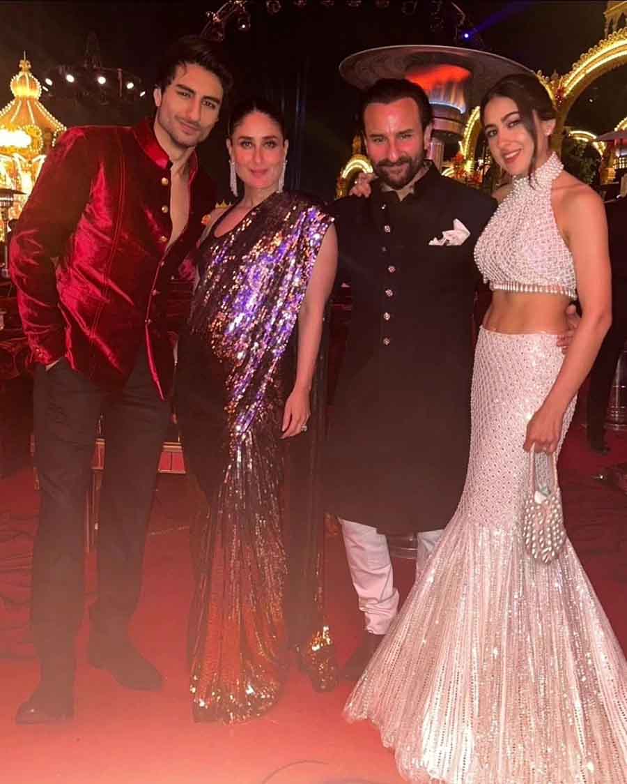 Saif Ali Khan posed for a family portrait with his children Ibrahim Ali Khan and Sara Ali Khan and wife Kareena on Day 2. Sara looked elegant in a pearl-studded ivory mermaid-cut lehenga set, while Ibrahim flaunted a maroon Nehru jacket.
