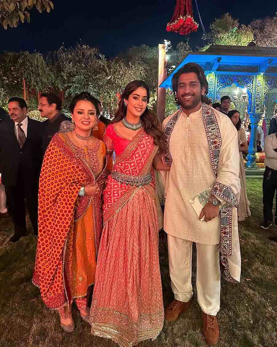Janhvi Kapoor struck a pose with former cricket captain Mahendra Singh Dhoni and his wife Sakshi Dhoni. While the Mili actress stunned in a peach embroidered sari and a vintage cummerbund, Sakshi sported a yellow salwar suit. Captain Cool opted for a white kurta and white shawl.