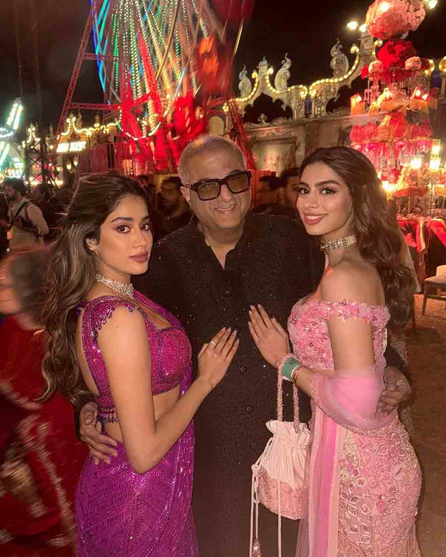 Janhvi Kapoor’s sequined purple sari was an eye-catcher too. Her younger sister Khushi Kapoor rocked a pink-and-white off-shoulder lehenga set with floral motifs. The sisters posed with their father Boney Kapoor.