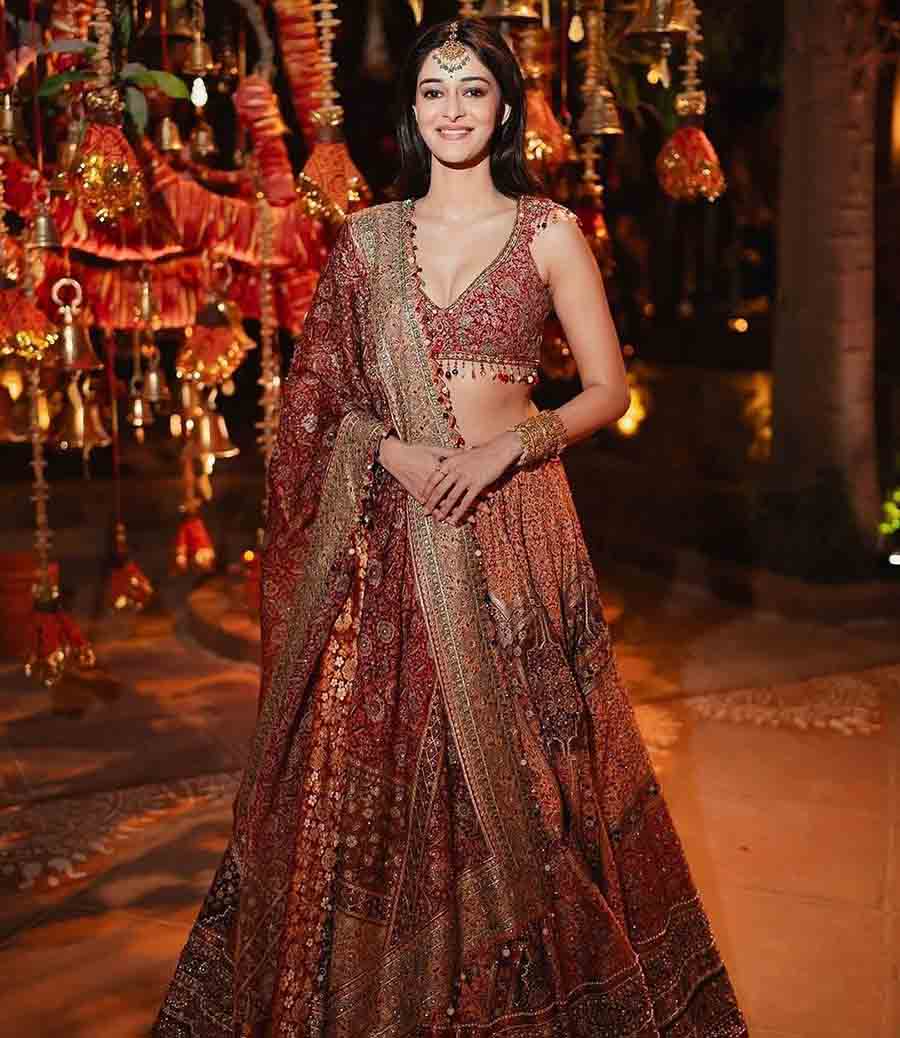 Ananya Panday turned heads in a rust-and-maroon lehenga decorated with floral and geometric motifs, crystals and beaded tassels, accessorised with a maangtika and bangles.