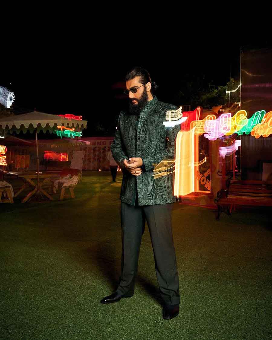 Arjun Kapoor paired a green textured Nehru jacket with black trousers and moccasins. The actor flaunted his man ponytail and a well-groomed beard.