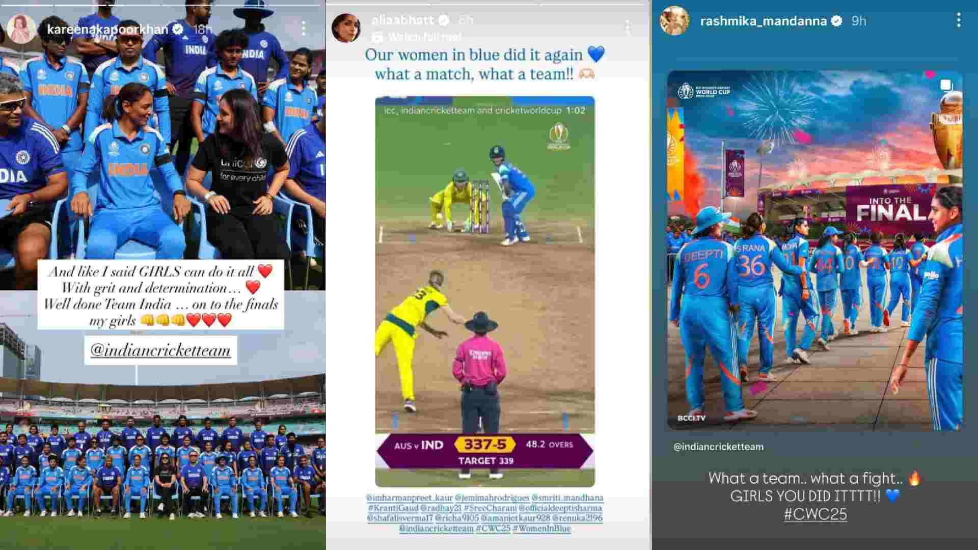 Actresses Kareena Kapoor Khan, Alia Bhatt and Rashmika Mandanna were among the Indian celebrities who congratulated the Indian women’s cricket team for their victory over Australia in the semi-final of the ongoing Women's ODI World Cup.