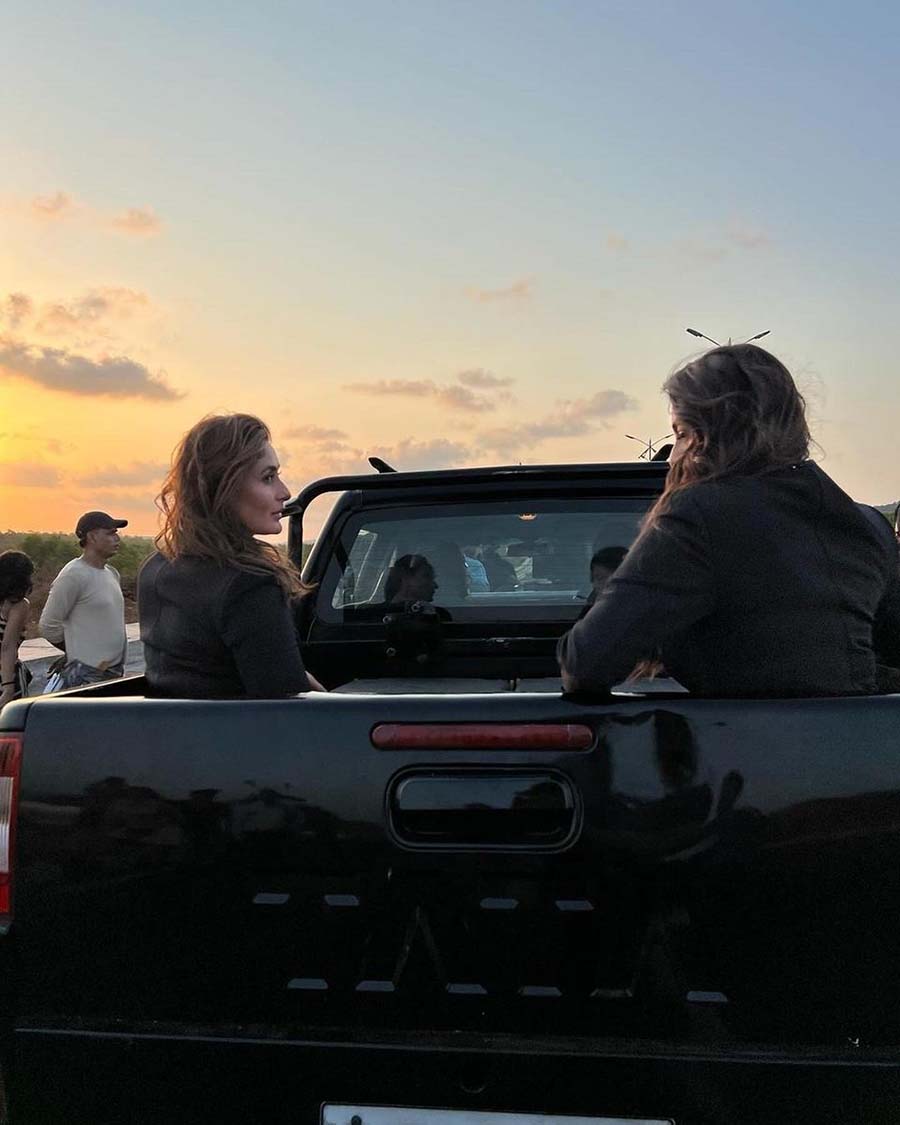 Kareena Kapoor Khan and Tabu were captured in a candid moment while shooting on a pickup truck in the desert. Kareena captioned her post, “Sundowner with my #Crew. #BTS #5DaysToGo.”