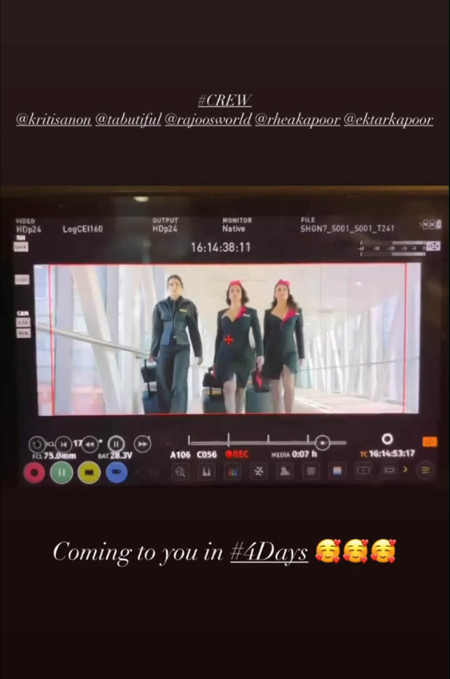 In a behind-the-scenes clip of the film shared by Kareena on her Instagram story, the trio — Kareena, Tabu and Kriti Sanon — can be seen dressed as air hostesses and walking on an aerobridge. The video clip was reposted by Kriti Sanon.