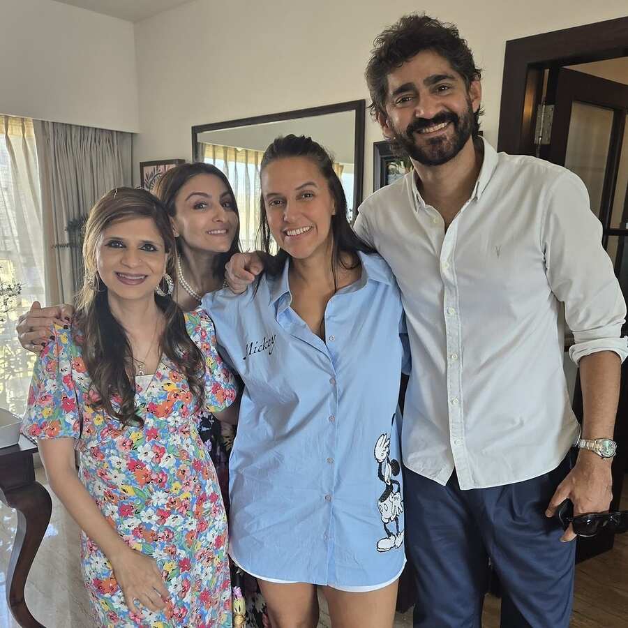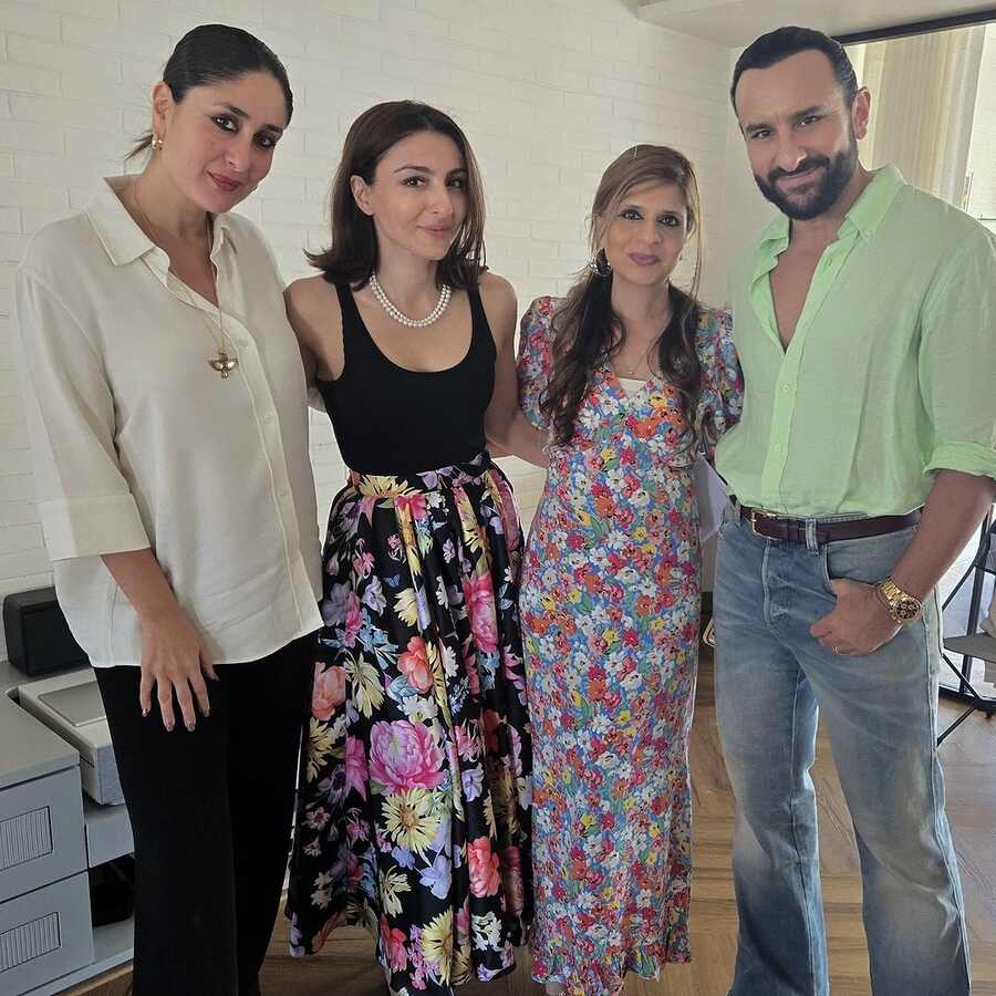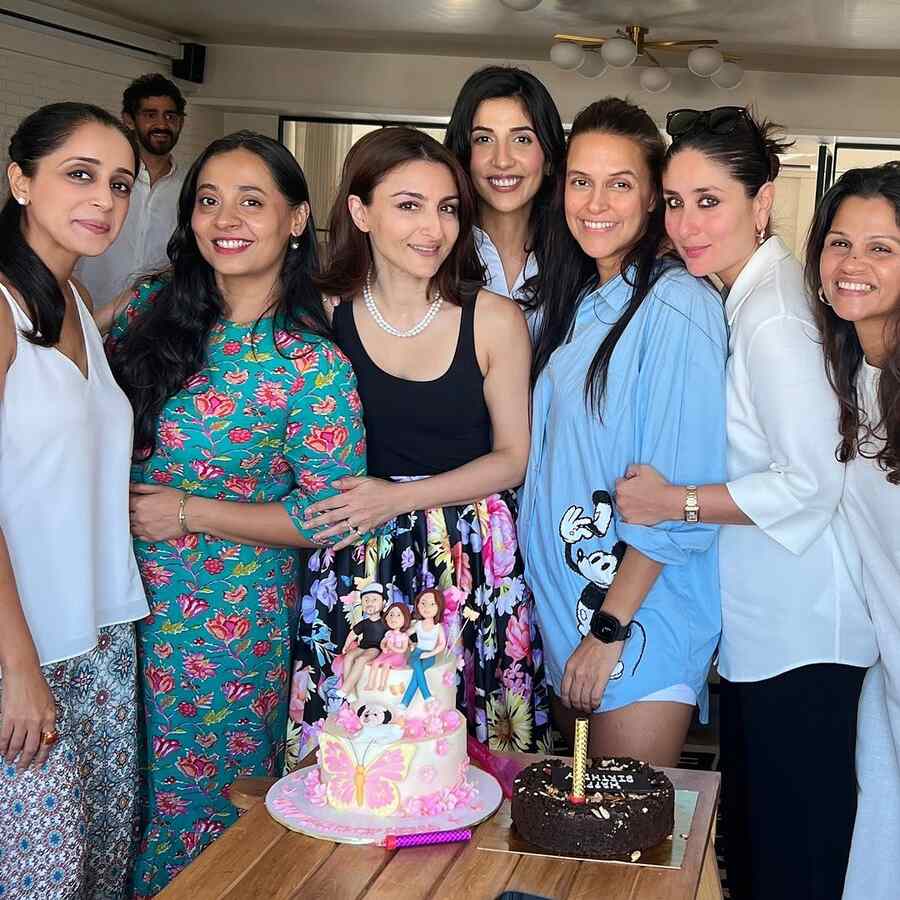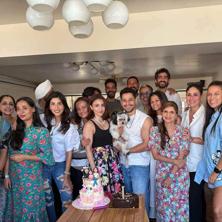 The birthday girl posed for a group picture with her guests. Kareena rocked an oversized white shirt, while Neha Dhupia sported a light blue co-ord set. Soha and her elder sister, Saba Pataudi, looked gorgeous in floral dresses. Kunal wore a white vest and accessorised it with his signature silver chain.